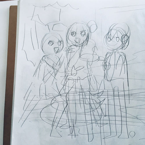 上のイラストのラフ。最初もろみの位置、さやかでした。